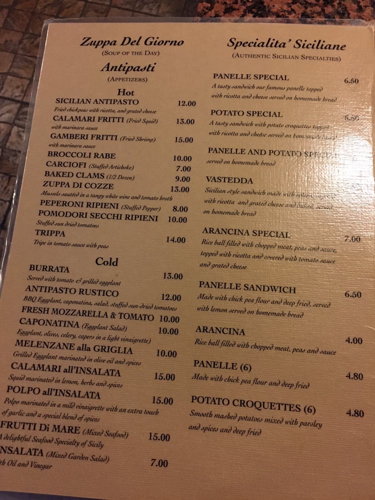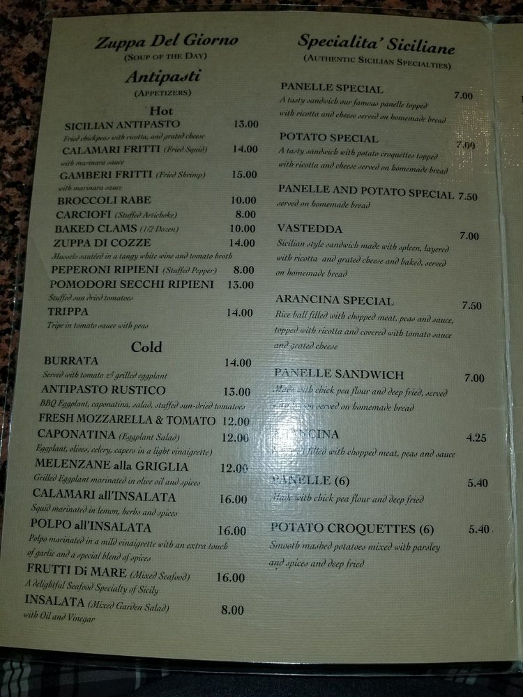 Ferdinando's Focacceria in Brooklyn, NY, is a charming Italian restaurant with a rich history dating back to 1904. The menu offers a wide range of traditional Sicilian dishes, including the highly recommended Vastedda sandwich, creamy Panelle Special, hot broccoli rabe, and flavorful arancini. The cozy ambiance, complete with mosaic tile floors and old-world decor, adds to the dining experience. Customers praise the warm and personable service, as well as the delicious and authentic flavors of the food. Whether you're looking for a nostalgic taste of Sicily or a comforting meal, Ferdinando's Focacceria promises a memorable dining experience in a lovely setting.